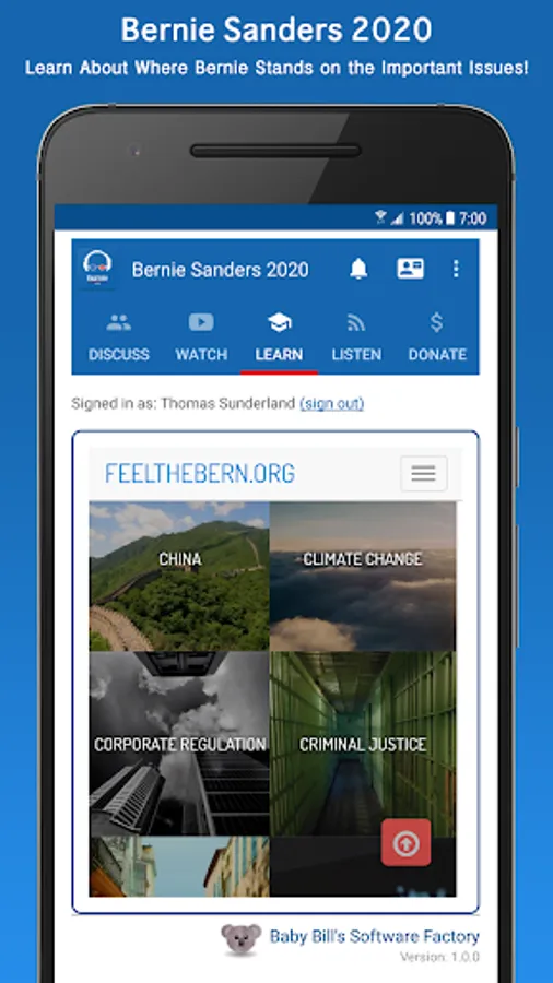 The "Learn" feature enables the user to learn all about Bernie Sanders' background and where he stands on the important issues.