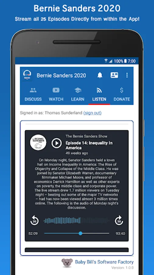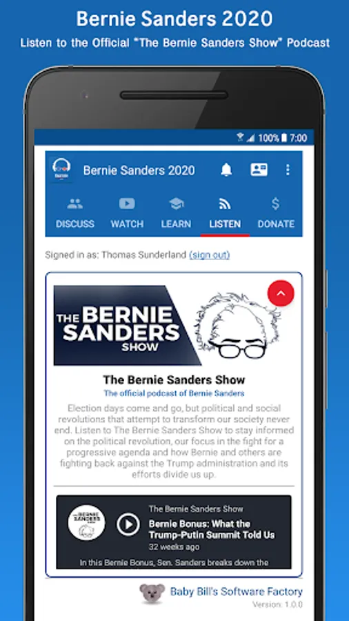 The "Listen" feature allows you to listen to the official podcast for Bernie Sanders, "The Bernie Sanders Show", which is completely integrated inside of the app. All 25 podcast episodes that have been published are available.