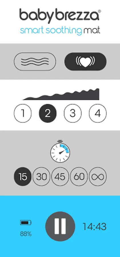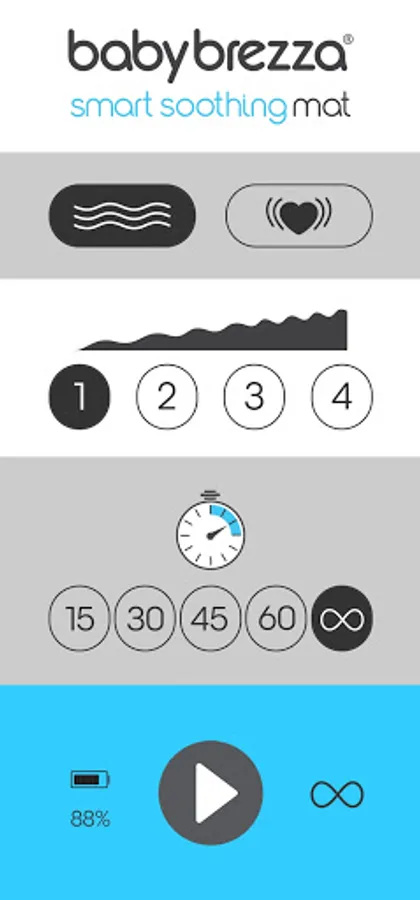 Download this FREE app to connect via Bluetooth and operate the Smart Soothing Mat (sold separately) from your phone, choosing from 8 different vibration levels and heartbeat settings and 5 different timer settings. The app also includes a built-in battery life indicator.