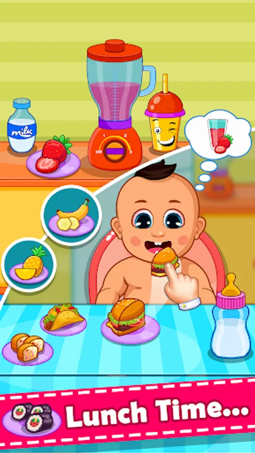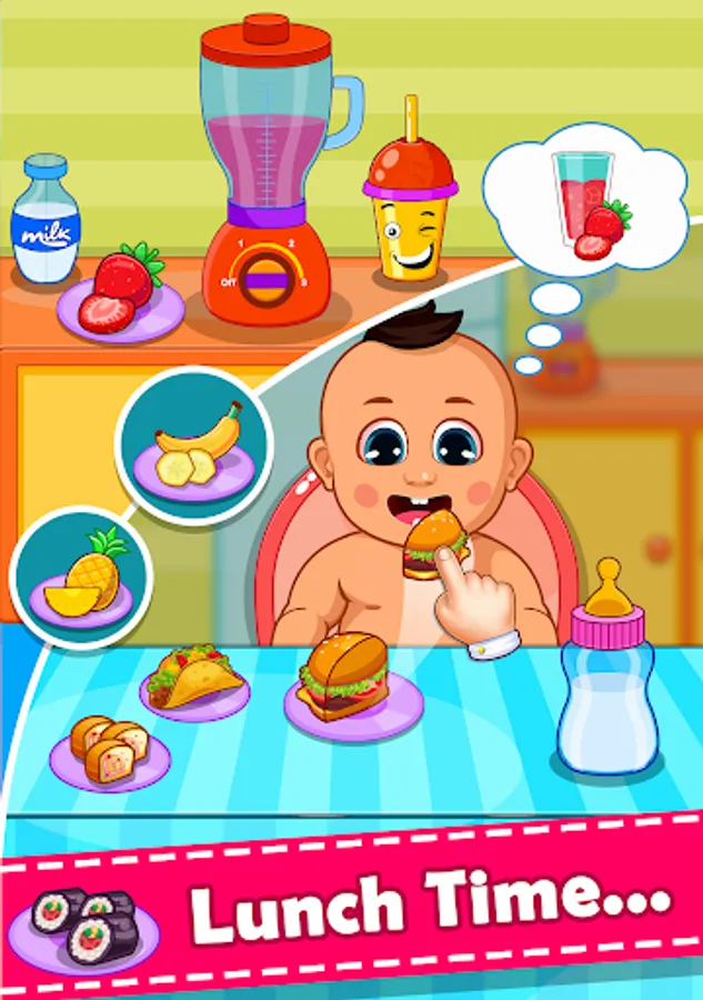 Baby Food 🍩 : Take Sweet baby to the feeding chair in the Kitchen and feed the Baby some delicious baby food including Pastry, Tasty Tacos, Sweet Shushi, Yummy Donuts, Burger, French Fries, Frankies, Hotdog and delicious Pizza.