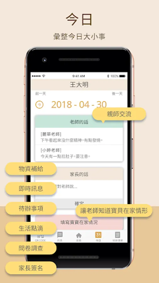 今 日:由系統自動抓出訊息、待辦事項、生活點滴、影音相簿以及園務行政等單元裡,屬於今天日期的項目,自動彙總摘要到此單元。