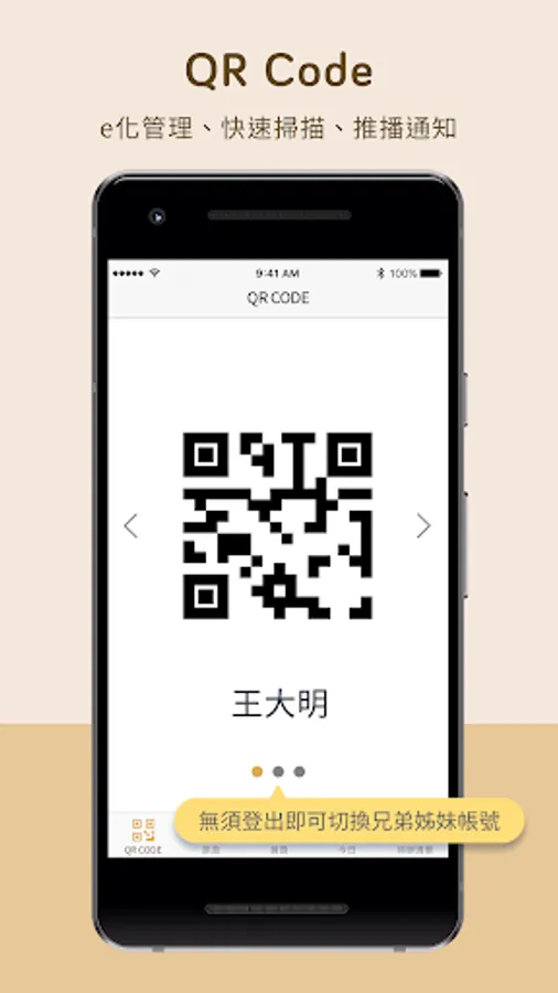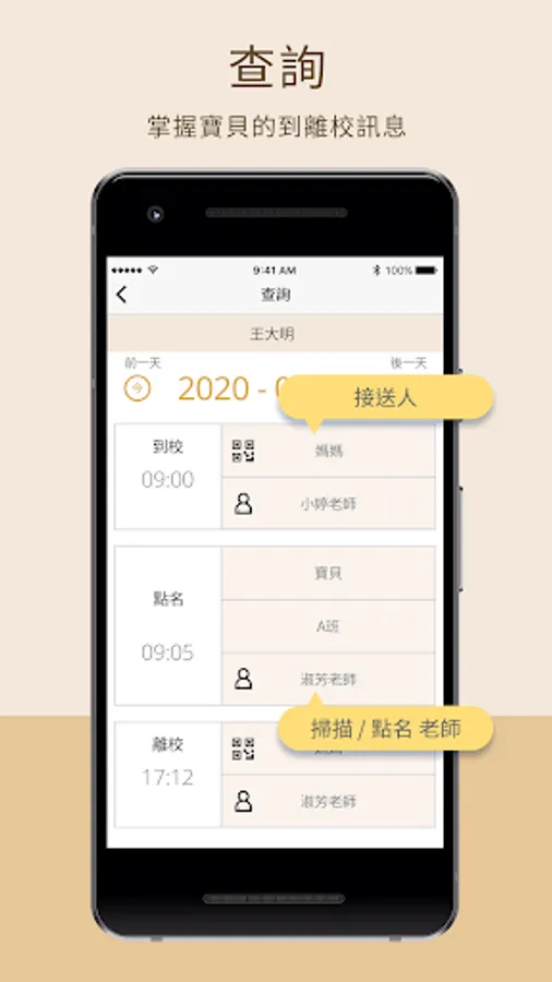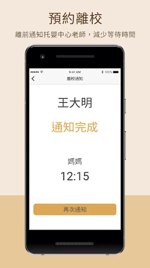 查詢及離校通知:幼兒的到校及離校,透過掃描資料條碼,記錄到校及離校的時間,以及接送家長及負責的老師。並自動推播通知主要聯繫的家長。家長在接幼兒回家前,可先按下離校通知托嬰中心,方便提早準備幼兒物品。