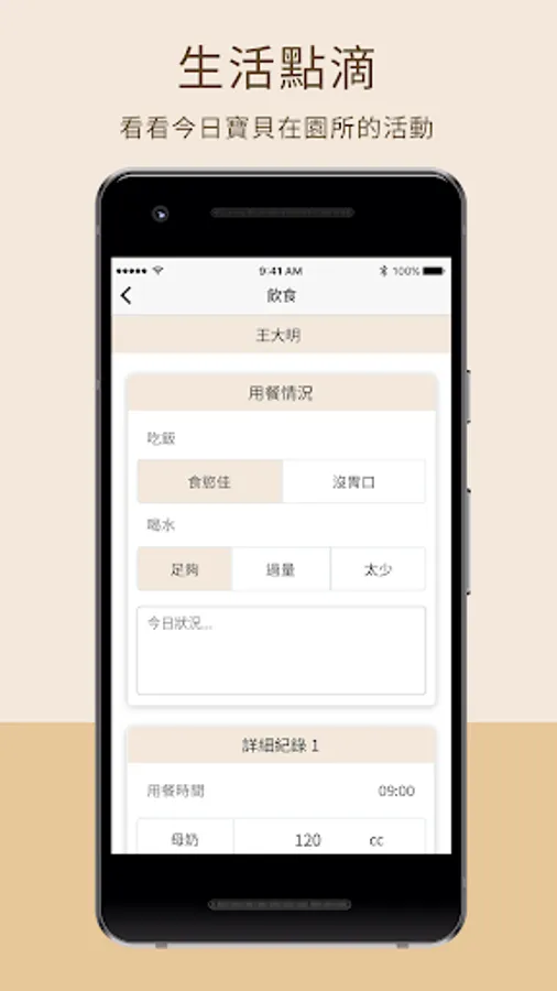 生活點滴:舉凡幼兒在托嬰中心裡的大小事,都由老師幫家長記錄下來。家長可以由此看到幼兒在園所裡的生活細節。
