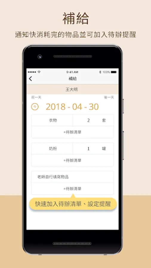 待辦清單:家長可以依據自己需要填寫新增,並設置提醒鬧鈴。