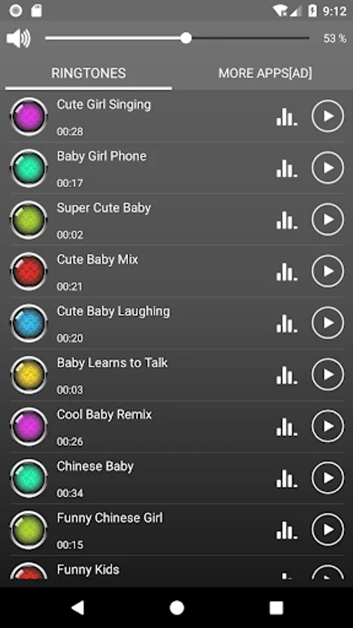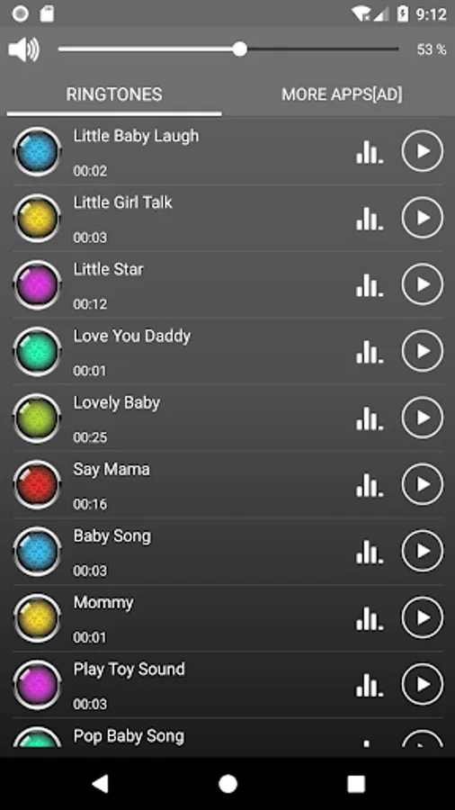 Open this baby sounds ringtones application, you can press the " play " button to listen to the MP3 music. If you like one of the MP3 music you can set it as your default phone ringtones, alarm or notification.