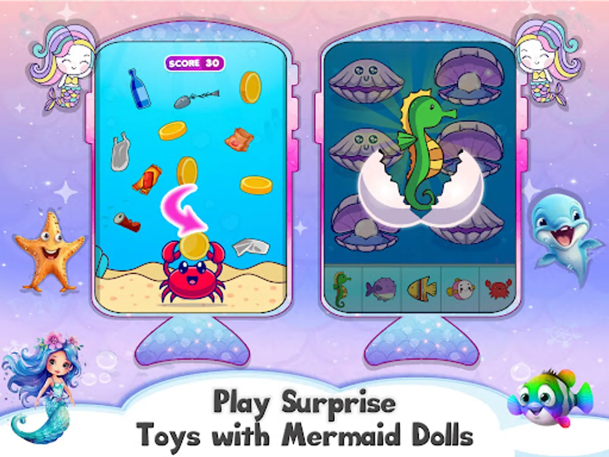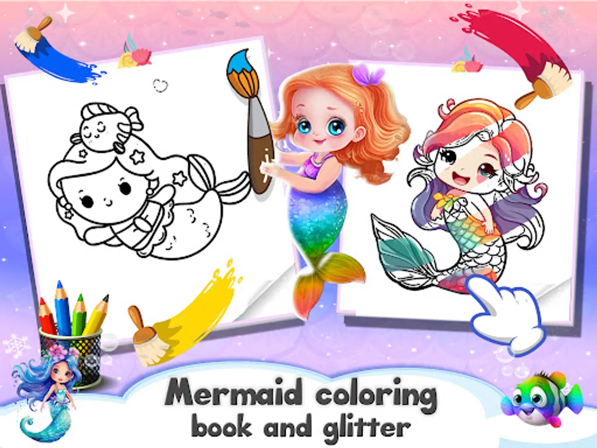 Choose from a wide array of mermaid-themed coloring pages and a vibrant color palette. Jigsaw puzzles featuring beautiful mermaid and adorable aquatic friends. Embark on exciting mini-games like helping crabs catch elusive coins.