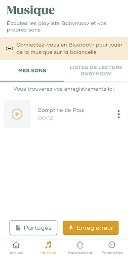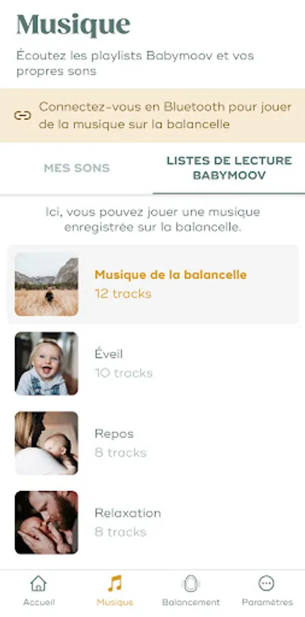 Thematic playlists (rest, awakening, relaxation, white noise) specially designed by Babymoov and suitable for toddlers are available exclusively on the app.