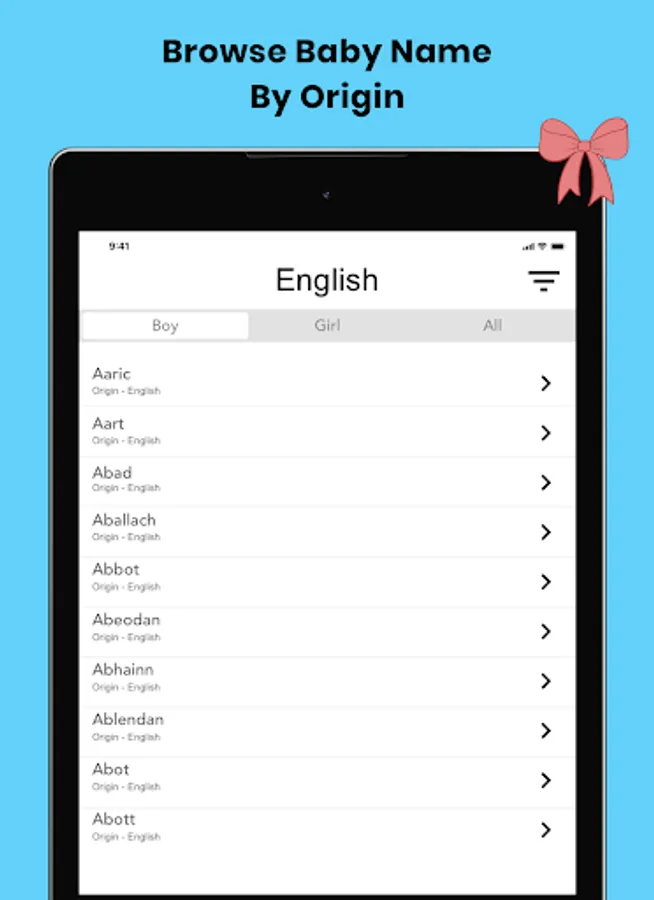 - Baby names sorted by nationality (Arabic, African, English language baby names, etc.)