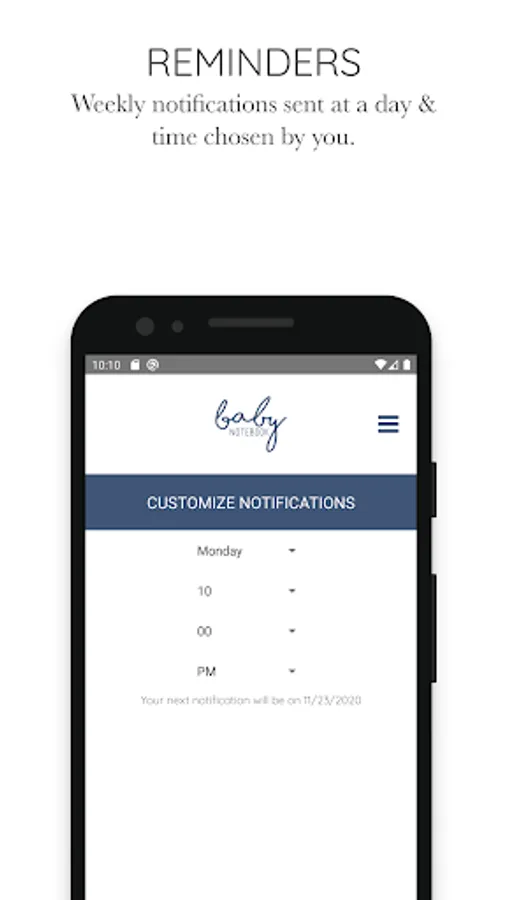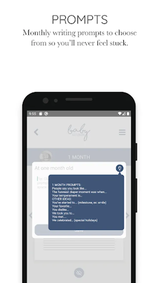You'll receive weekly push notifications personalized to fit your busy parenting life—reminders for milestones, and relevant writing prompts (with additional ideas in the Baby Notebook app).