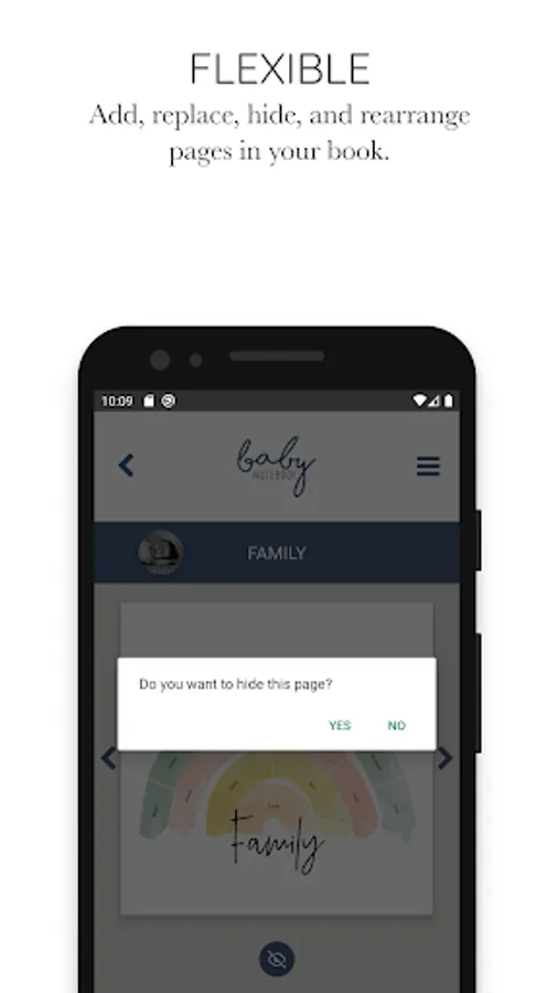 The Baby Notebook app allows for the flexibility to hide pages, replace page layouts and rearrange pages in your book to ensure you can actually complete your baby book (no pages left blank).