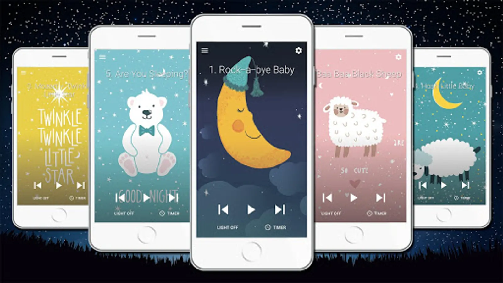 Brahms Lullaby, Twinkle Twinkle Little Star, Hazy Little Baby, Mozart's Lillaby for the brain development.