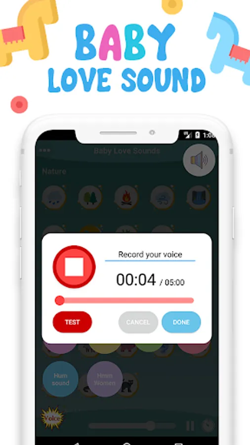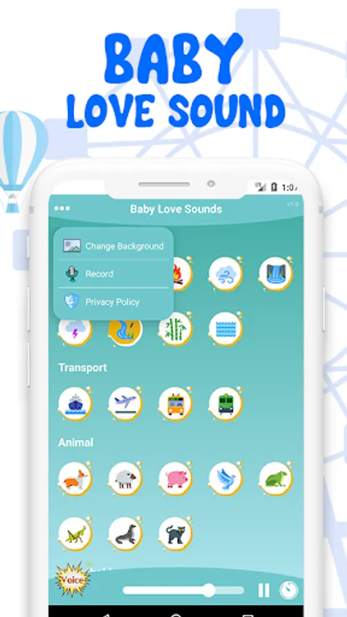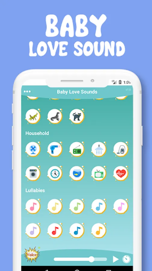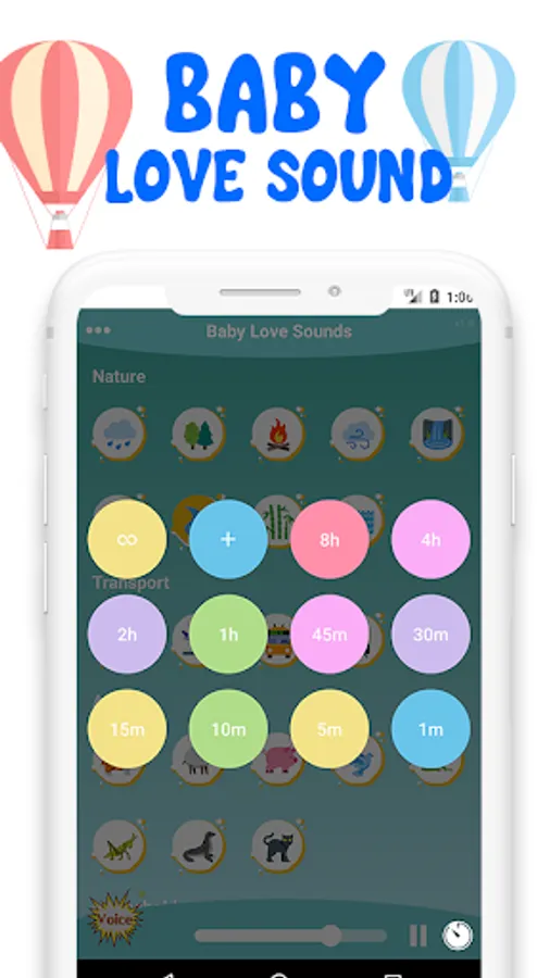 ★ Rain ★ Forest ★ Ocean ★ Wind ★ River ★ Night ★ Fire ★ Heart ★ Car ★ Train ★ Plane ★ Washing machine ★ Vacuum cleaner ★ Clock ★ Fan ★ Radio ★ Hair dryer ★ Shower ★ White Noise ★ Brown Noise ★ Pink Noise ★ 4 gentle lullabies