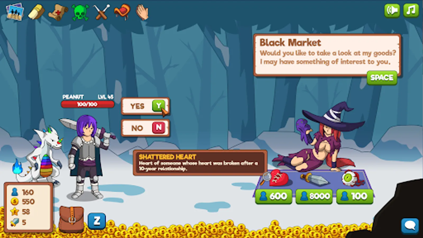● Make Good Deals - Purchase sweets and potions with your gold coins or trade your followers in the black market for rare items.