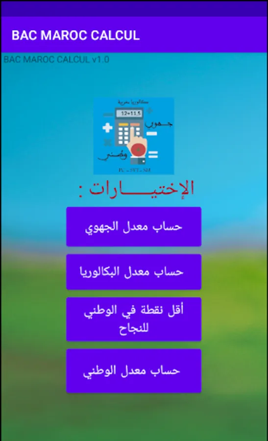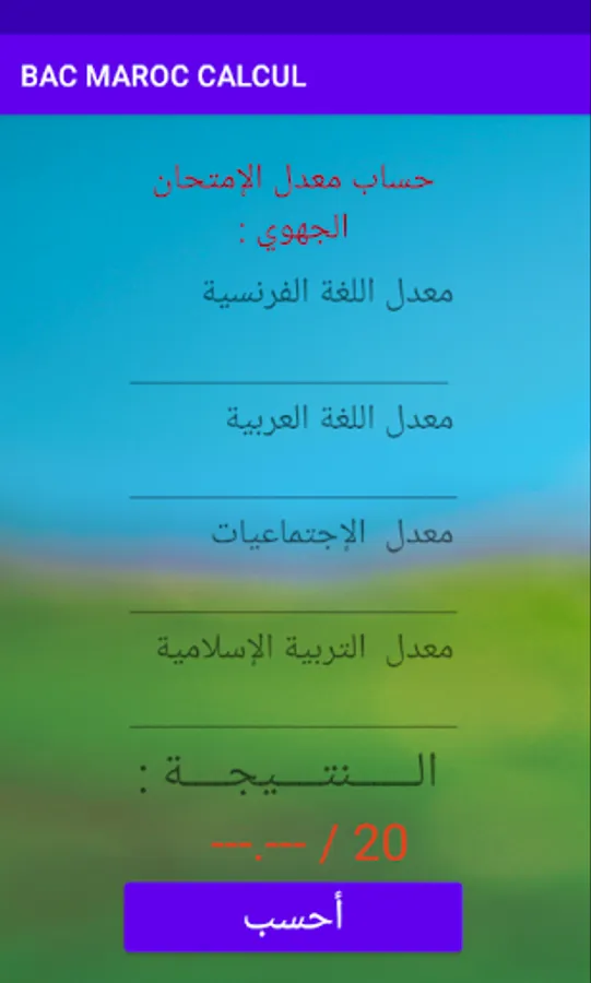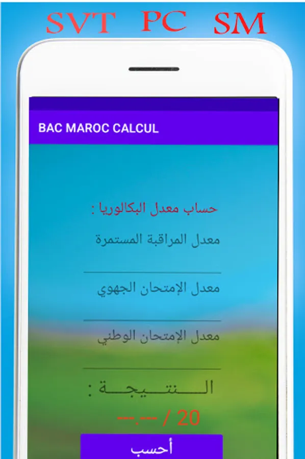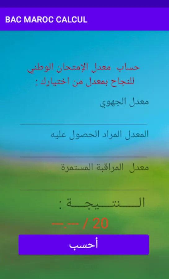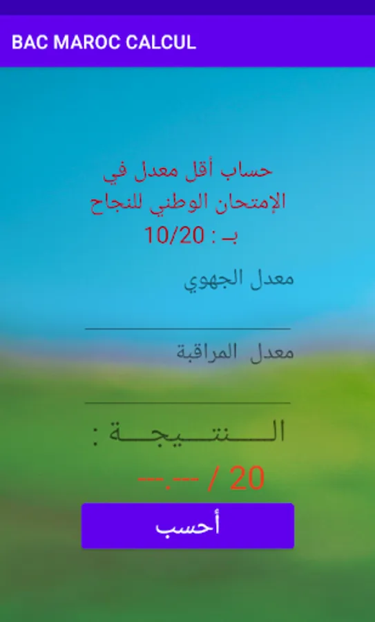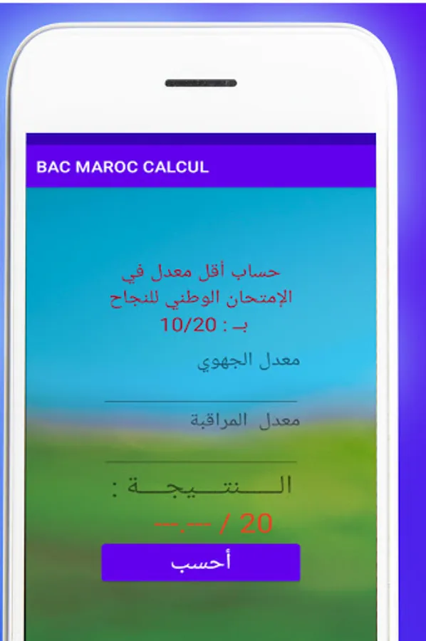 Cette application permettre aux lycéens du MAROC de calculer leurs notes générales du Bac, la note de l'examen régional et la note minimale à avoir dans l'examen national pour réussir son bac ou la note de l'examen national pour avoir son bac avec une moyenne donnée.