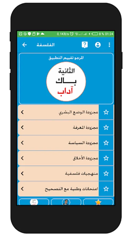 As for the second section, it contains all the lessons of the second Islamic education in the Etiquette Bucket, and in the third section you will find a summary of the second vehicle language lessons in the Etiquette Bucket. As for the fourth section, it contains all the lessons of philosophy for the second level, Bak Etiquette. It introduces you to the origins and history of philosophy. From this section, you can acquire the methodological tools for analyzing philosophical texts.
