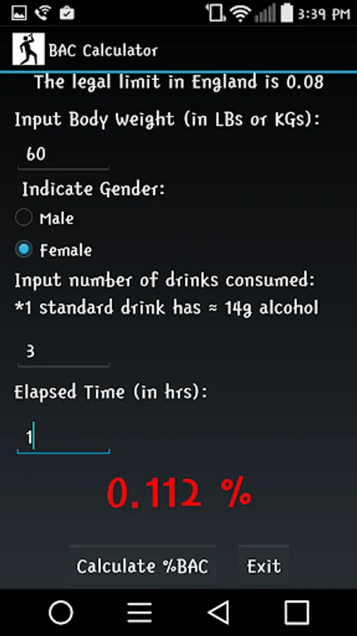 The default unit for body mass is in pounds for the default country(United States); to input weight in kilograms, simply select any other country that defaults to metric units, or switch the toggle metric button to "ON". Your calculated %BAC result will turn red when it has exceeded the legal limit for the selected country and will change to reflect accordingly as soon as another country is selected.