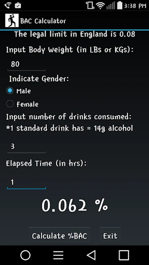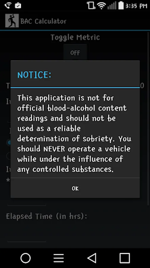 Notice: This application is not for official blood-alcohol content readings and should not be used as a reliable determination of sobriety. You should NEVER operate a vehicle while under the influence of any controlled substances. Legal BAC limits may vary by country for professional drivers, inexperienced/underage drivers, or operators of heavy machinery; Intended for the use of mature audiences; for informational/novelty purposes only.