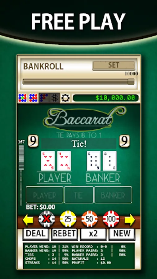 This is the classic game of Baccarat played in casinos all over the world. Use it to practice different strategies and grow your bankroll.