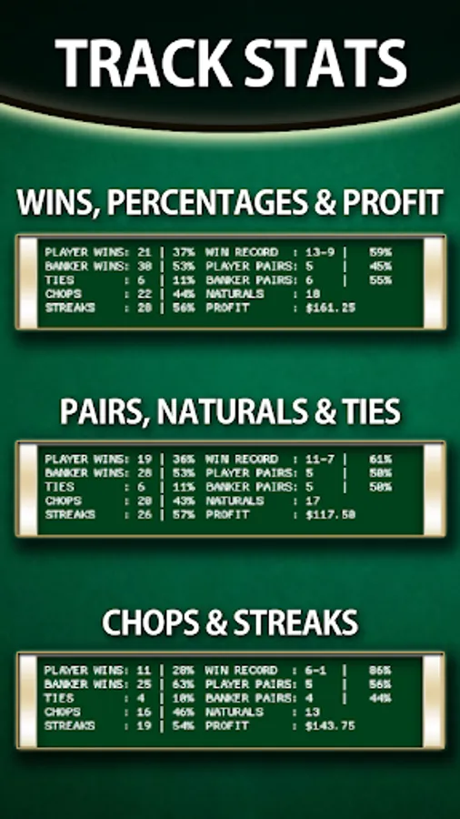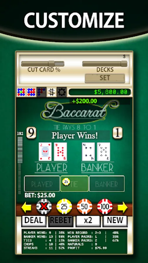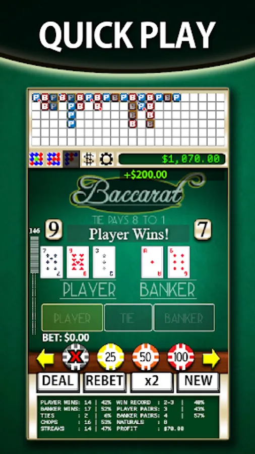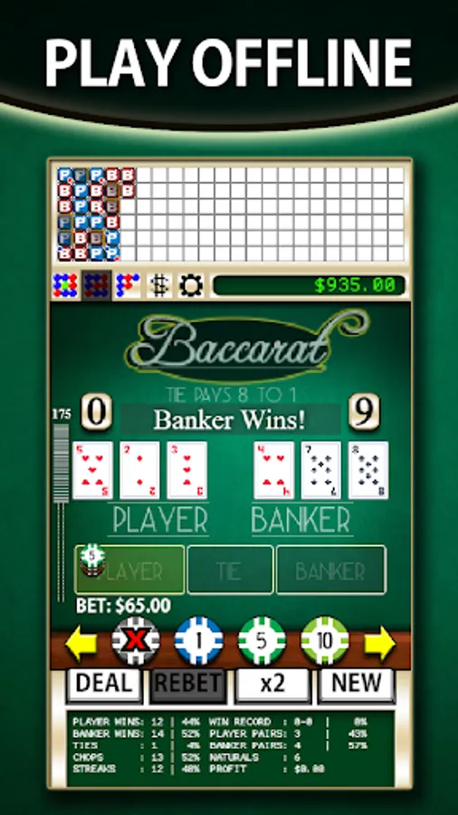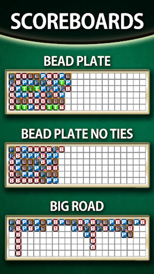There are 3 scorecards, the red and blue circles marking a player or banker win, that can be used to track results and work different strategies. Practice money management, count cards or anything else with the Baccarat Simulator!
