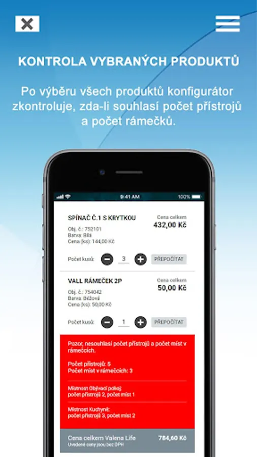 In the configurator you will find the complete range of Valena Life series. You can always see the product picture, its exact description and the gross price. You simply choose the number of products in each room.