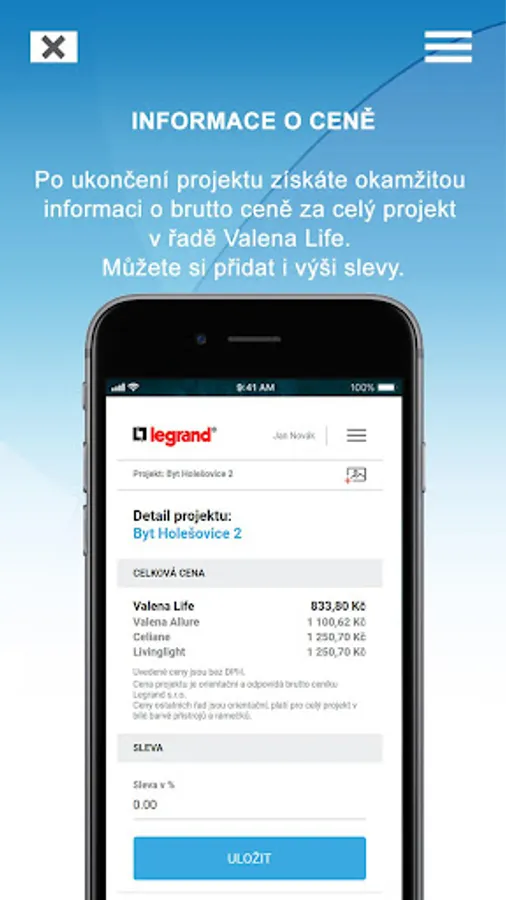 Upon completion of the project, you will receive immediate information on the gross price for the entire Valena Life project. You can also add the amount of discount you want to give. At the same time you can inform the client about the approximate prices of other Valena Allure, Céliane, Bticino LivingLight series.