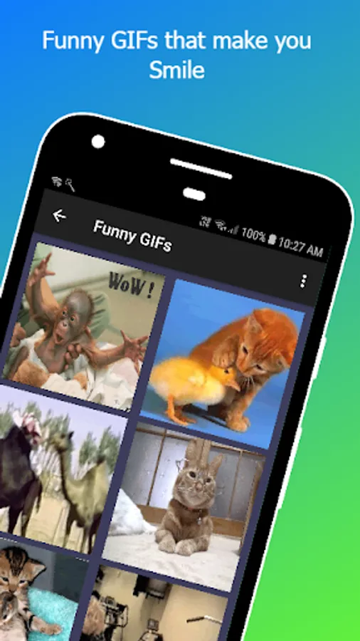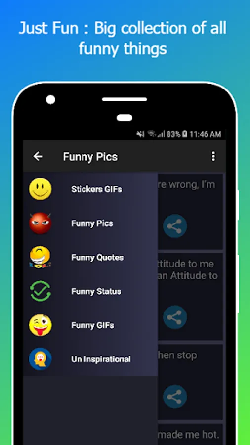 The app Contains Funny and Happy Stuffs like Funny GIfs, Funny Pics, Funny Quotes, Funny Stickers and GIF Stickers.