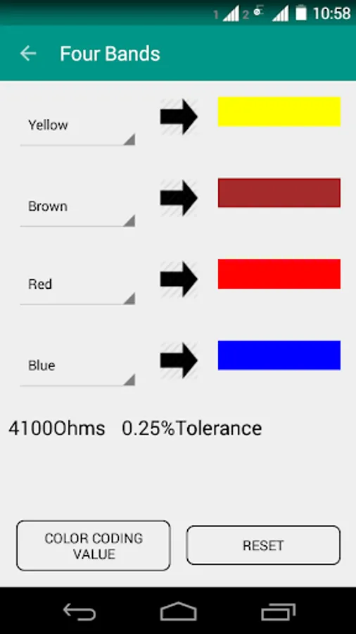 * Color Coding values for different types of color bands for capacitors and resistors.
