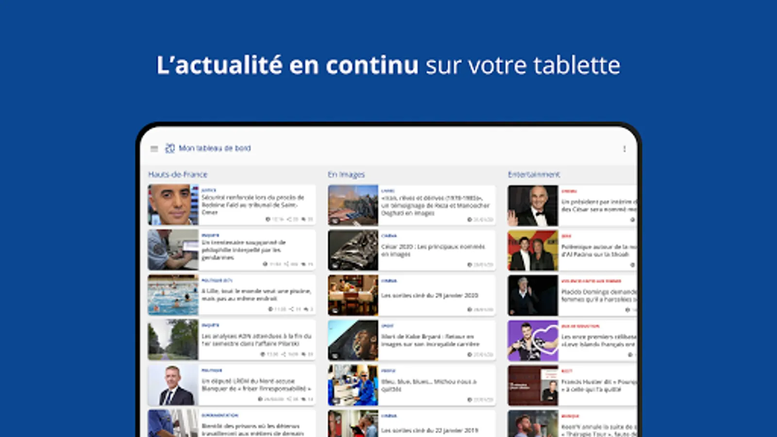 A single application that can be viewed both on your smartphone and on your tablet. Discover our brand new ergonomics and our tailor-made features that will allow you not only to access the latest news, but also to perform the following actions: