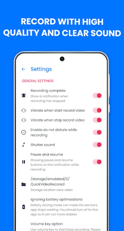 + Click the pink floating button in the app or click the Video Recorder shortcut/widget to start and stop recording.