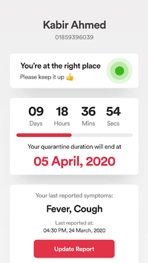 The app helps symptomatic patients stay home for their own and other's safety, totally at their consent. It also helps them report any developing symptoms they may have to local authorities.