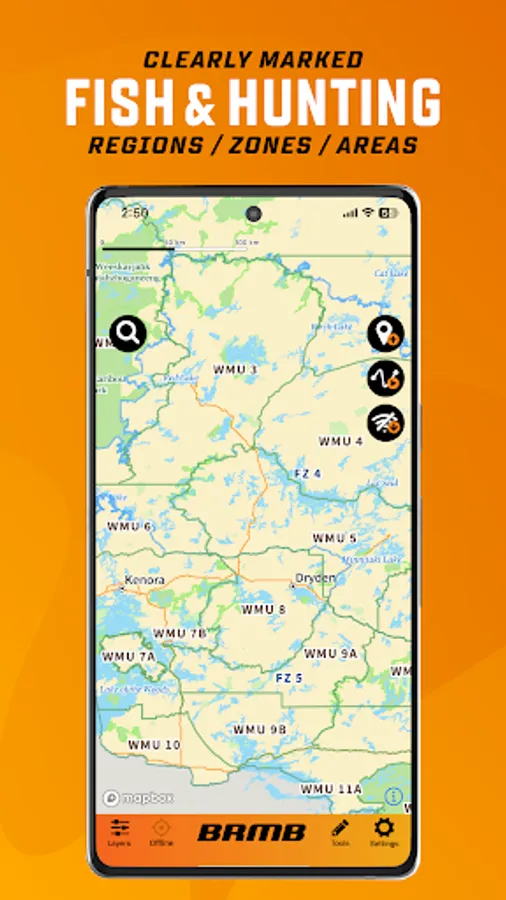 - Fish zone boundaries, lake bathymetry, stocked lakes, marinas, boat launches and more