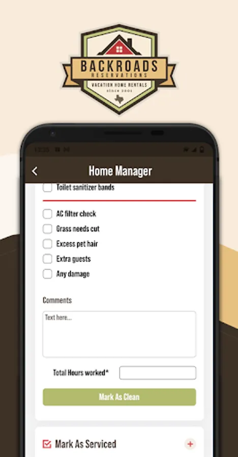The BKRDS app is private and used by vacation home owners and house cleaners to manage their Backroads Reservations guests, calendars, tasks, repairs and supply inventory.