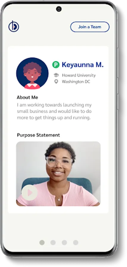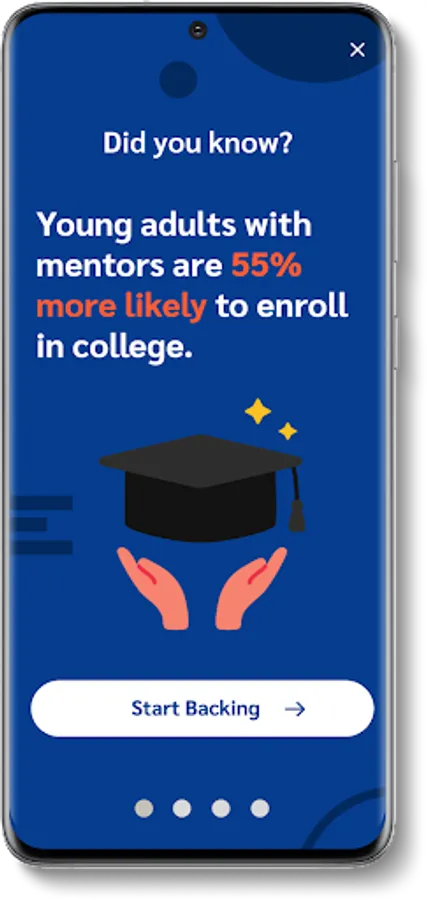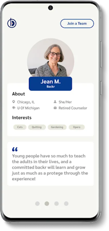 Young people who join Backrs become proteges who receive a variety of resources from their personalized team of Backrs: money, knowledge, engagement, and connections. Young people also chronicle their journey and share updates with their team.