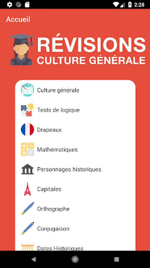 The MCQ General Culture application provides you with a wide range of topics to revise.