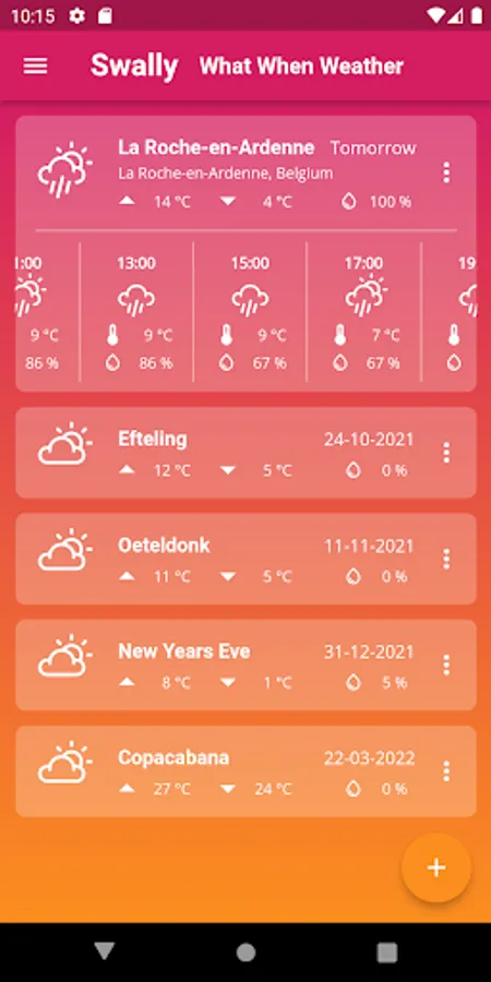 Enter a location, the date you want to go, share your weather prediction with friends and Swally is set. Quickly see what the weather will be. You will also receive updates. No need to start a separate weather app, scrolling to the correct date, and oh wait, you still have to adjust the location. Swally shows the weather outlook right away!