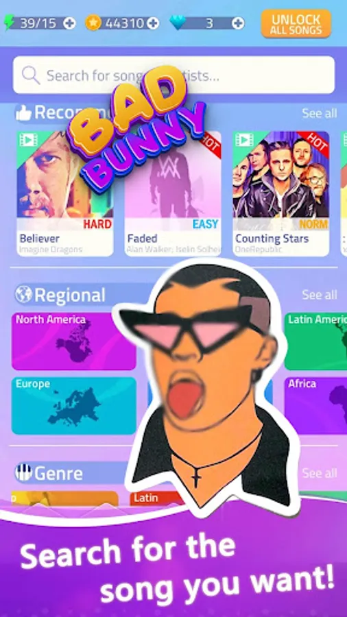 BAD BUNNY Piano Tiles is a captivating and immersive music game available on the Google Play Store, meticulously crafted for fans of BAD BUNNY songs and the vibrant world of his music. This engaging game combines the spellbinding melodies of BAD BUNNY's most popular tracks with the thrilling challenge of tapping piano tiles in perfect harmony.