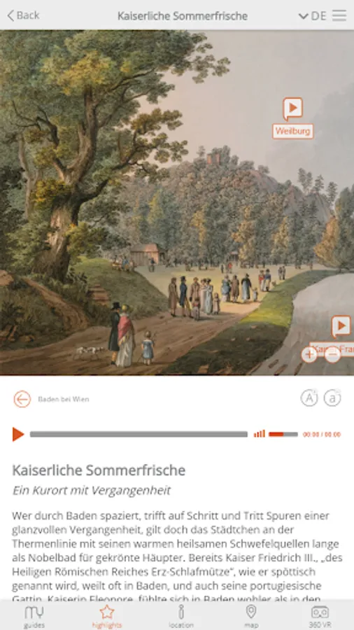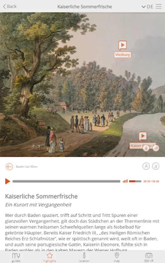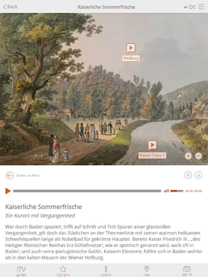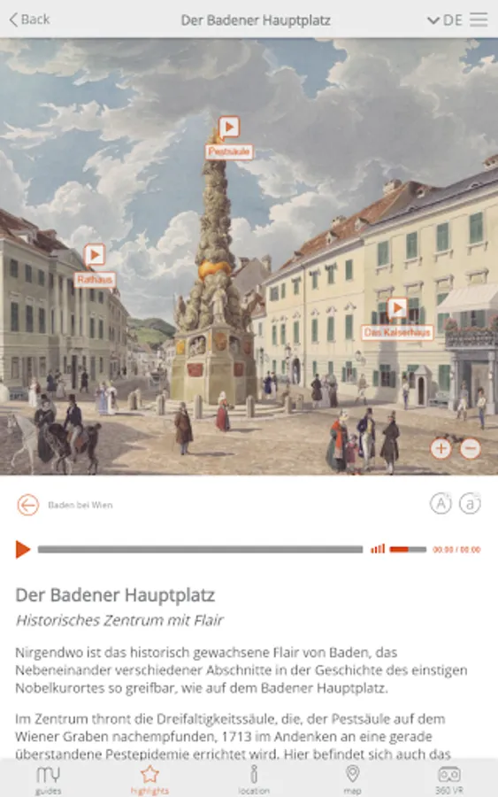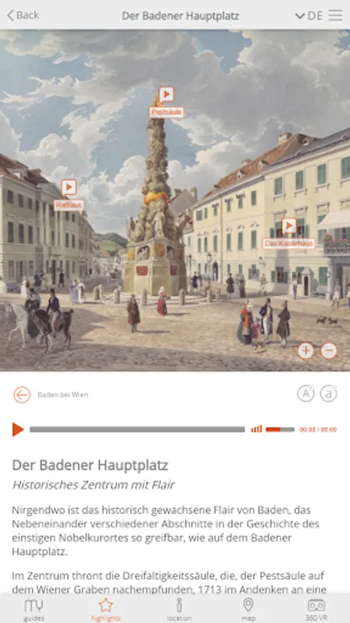 Alle Guides von beyondarts besitzen neben Text und Bildern auch eine mehrsprachige Audiofunktion. Baden bei Wien bietet dir den Audioguide für das eigene Smartphone. Mit spannendem Story-Telling speziell für deinen Audiogenuss aufbereitet.