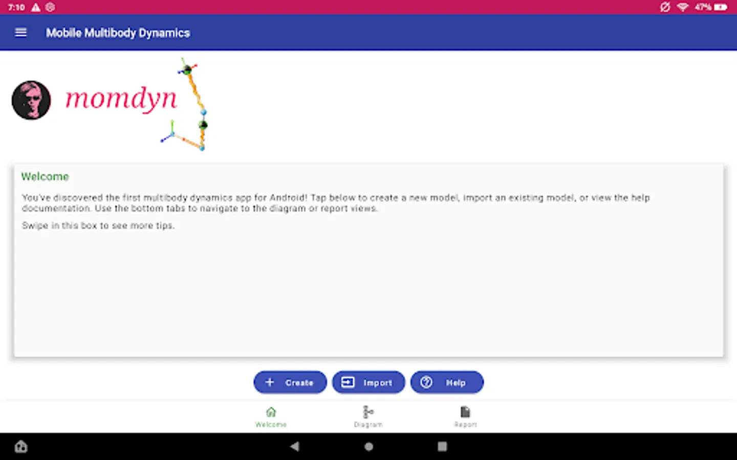 Mobile Multibody Dynamics (MOMDYN) is the first multibody dynamics app for Android. MOMDYN provides an easy to use graphical interface that is familiar to engineers and physicists who have studied classical mechanics, with a limited but powerful set of features similar to modern modeling and simulation software. The software forms a bridge between the"first-principles" approach to dynamics problem solving where one defines kinematic and dynamic equations by hand before developing custom code for each individual system, and the modern approach where the fundamental mathematical equations are obfuscated behind a purely graphical, computer aided design (CAD)-like interface.