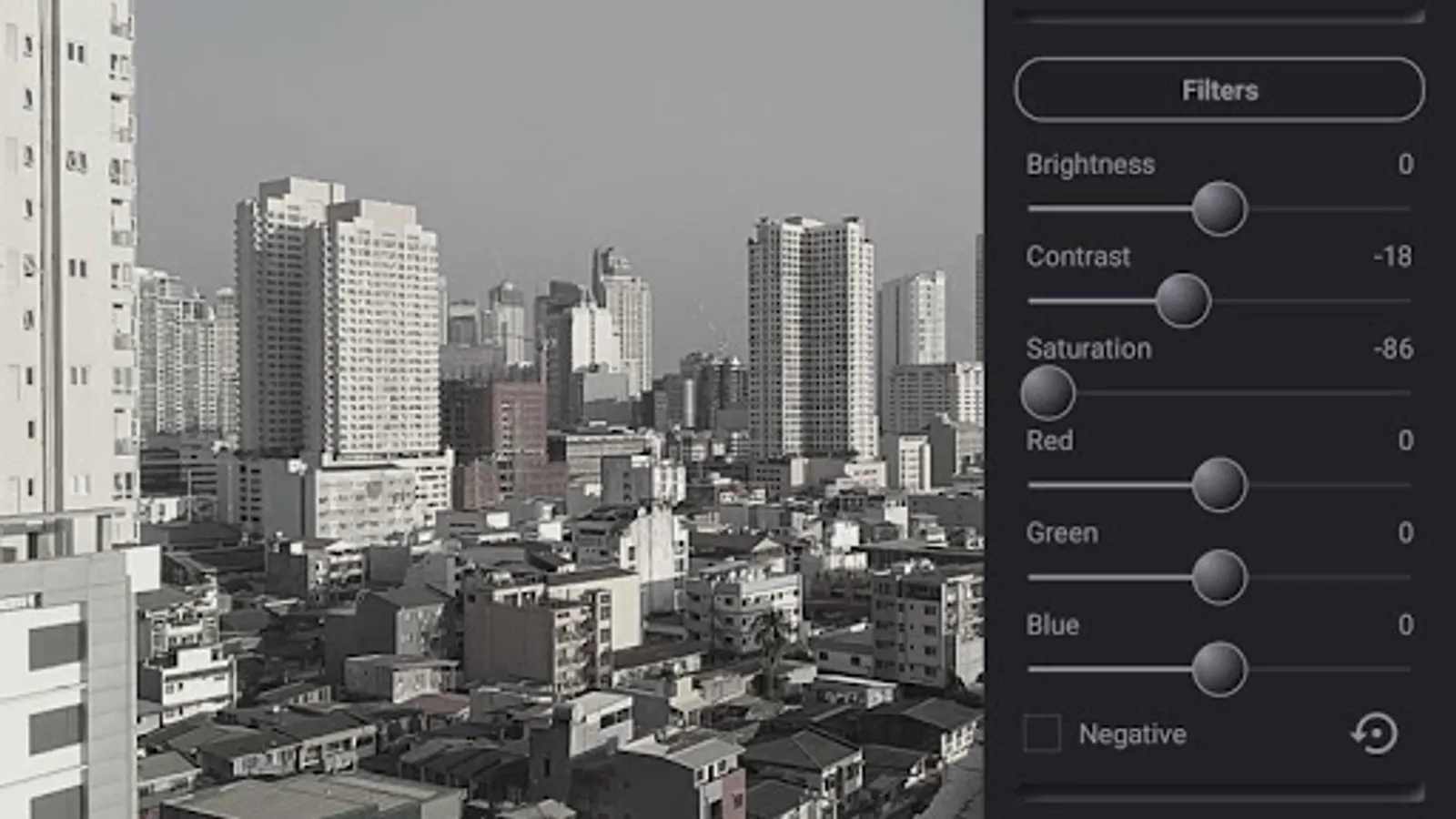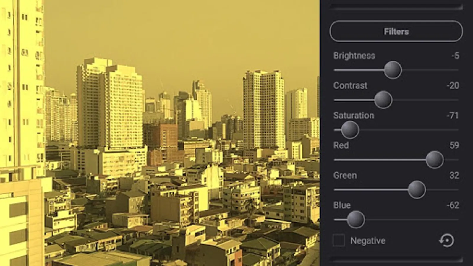 - Controls for setting Brightness, Contrast, Saturation, Red, Green, Blue, Negative, Highlights, and Shadows filter.