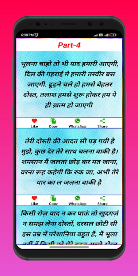 Dosti Shayari In hindi app is very easy to use interface just scroll up and down to read Hindi Dosti Shayari and easily set that as your Whatsapp status or FB status. This app gives you the sad Whatsapp status in Hindi without any Internet connection.