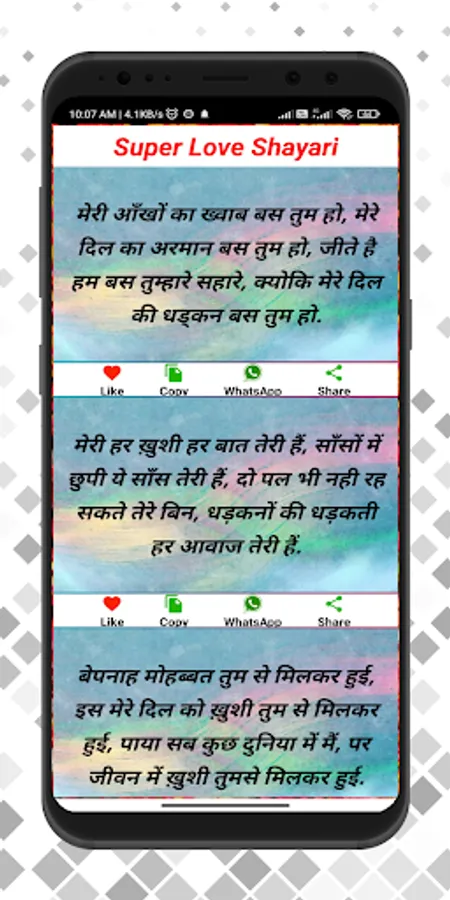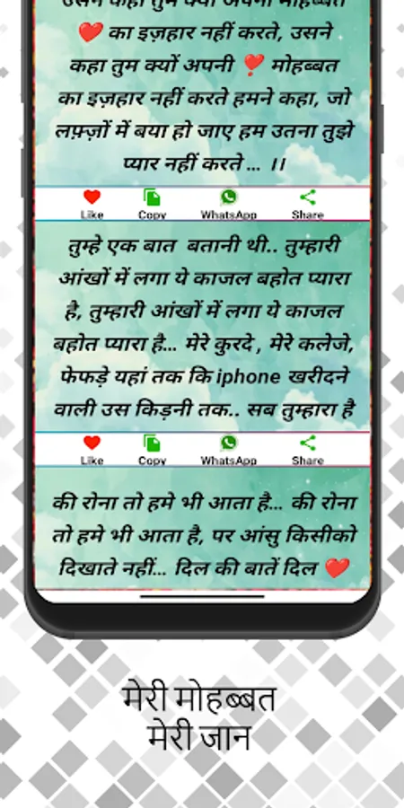 This app is the right place for Specially Romantic Shayari on every in class categories like Romance ,Miss you Shayari, Pyar Shayari, Mohabbat Shayari, Propose Shayari etc.