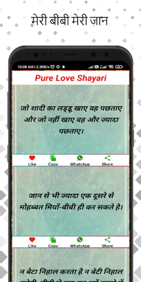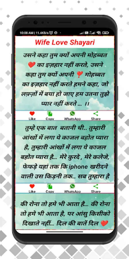 Pyar mohabbat shayari app has lots of amazing features you can easily use it without the internet. This New Love Shayari Hindi app has hindi shayari categories like pyar bhari love shayari and premika shayari in hindi etc.
