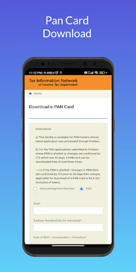 You must have an Acknowledgement Number to download e-Pan Card, then you can download e-Pan Card very easily. Now tell you how you can download e-Pan Card from this app. The e-Pan Card download link is given in this app on which you will be able to click on the direct downloading page, you will first have to give an Acknowledgment number after that, after entering the Captcha Code, click on submit button Once again a new page will open, there will be one one time password (OTP) on your registered mobile number, after entering that OTP, you will be able to download PAN card.