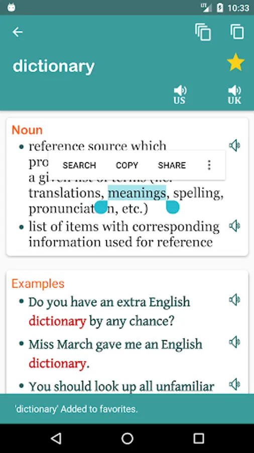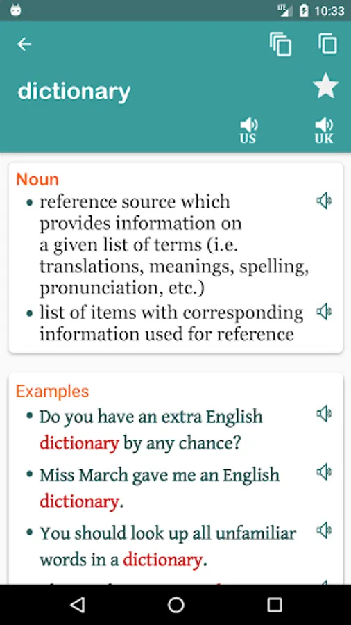 - Offline pronunciation and audio (your device must have TTS installed and active).