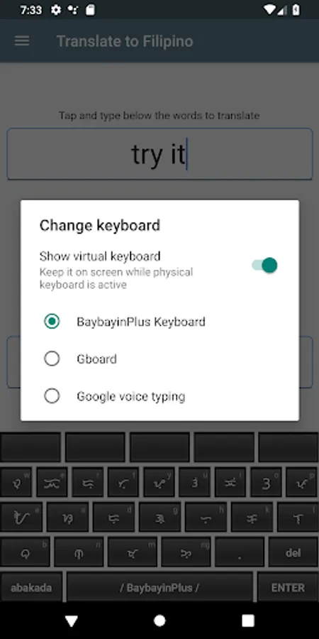 For folks having problem looking for the keyboard, it does exist as long as your OS and phone supports the character sets which the app uses for Baybayin. In general try to follow these steps: