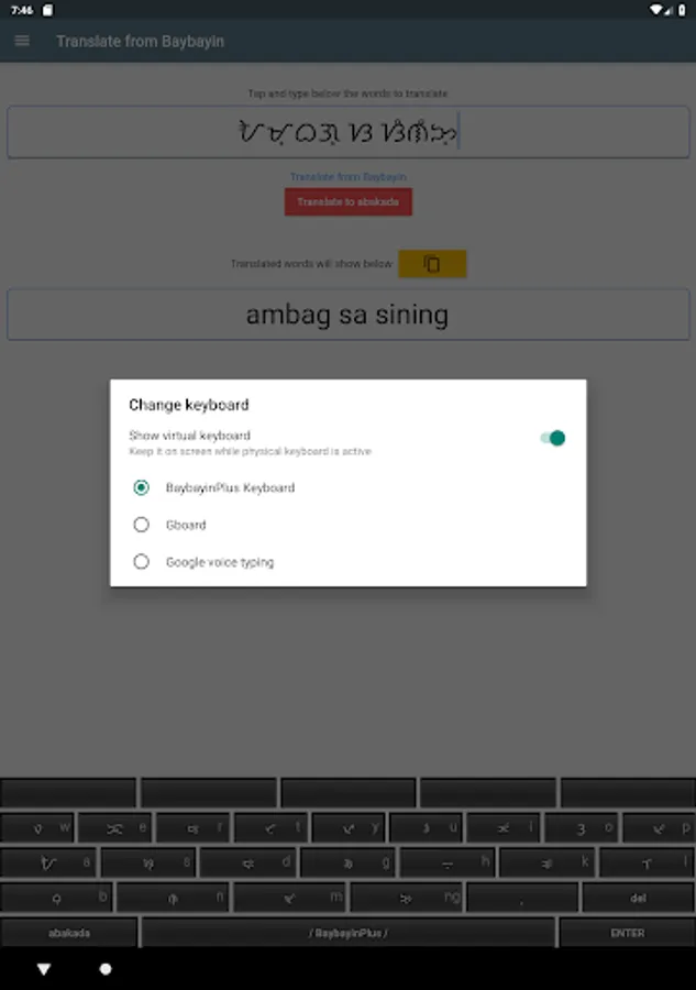 The keyboard is a semi-traditional Baybayin characters and not the modern alphabet (as of this version).