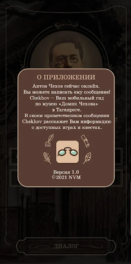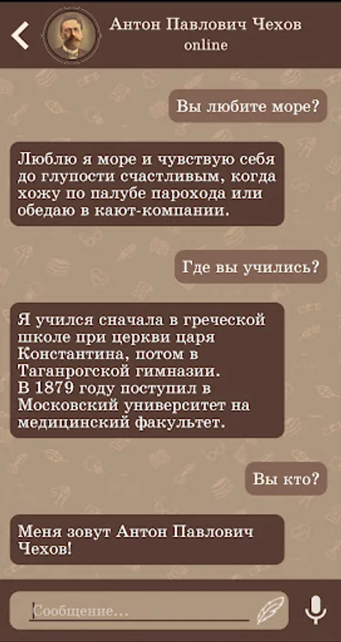 Anton Pavlovich Chekhov is the only writer who left behind about 30 volumes of the manuscript, where 17 of them are works, and 13 are notes and letters. All this serves as the basis for communication with the reconstructed copy of Anton Pavlovich and ensures the reliability of the information received. Thus, our application acquaints users not only with the life and work of the great writer, but also with his thoughts and apt sayings.