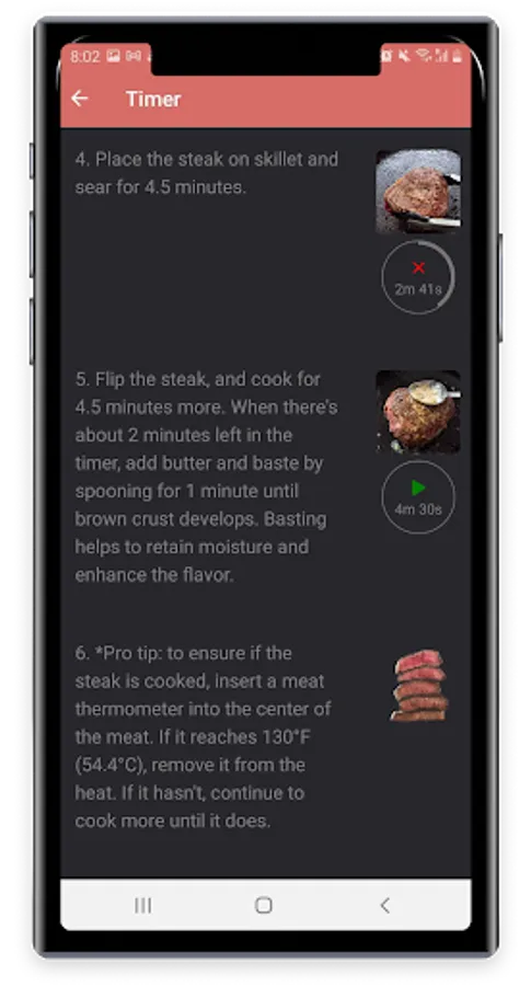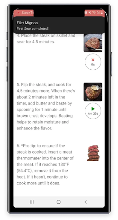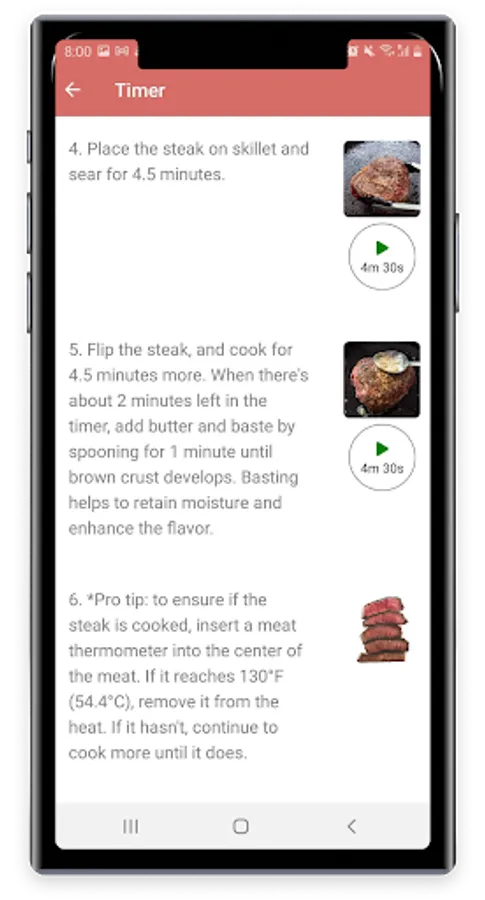 The app's detailed instructions make cooking steaks a breeze. Each step is accompanied by precise directions and corresponding images, ensuring you achieve the perfect sear, temperature, and doneness every time. For instructions that require precise timing, reusable timers are included, eliminating any guesswork. Whether you're searing, resting, or finishing off in the oven, this app has got you covered.