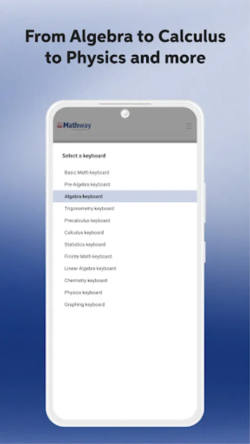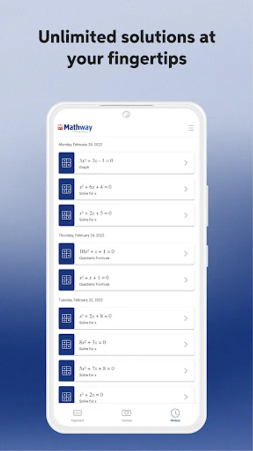 Mathway is the world’s smartest math calculator for algebra, graphing, calculus and more! Mathway gives you unlimited access to math solutions that can help you understand complex concepts. Simply point your camera and snap a photo or type your math homework question for step-by-step answers.