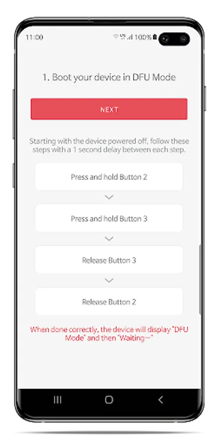 Boot your device in DFU mode, select new firmware to upload, pair with your device to update, and upload.